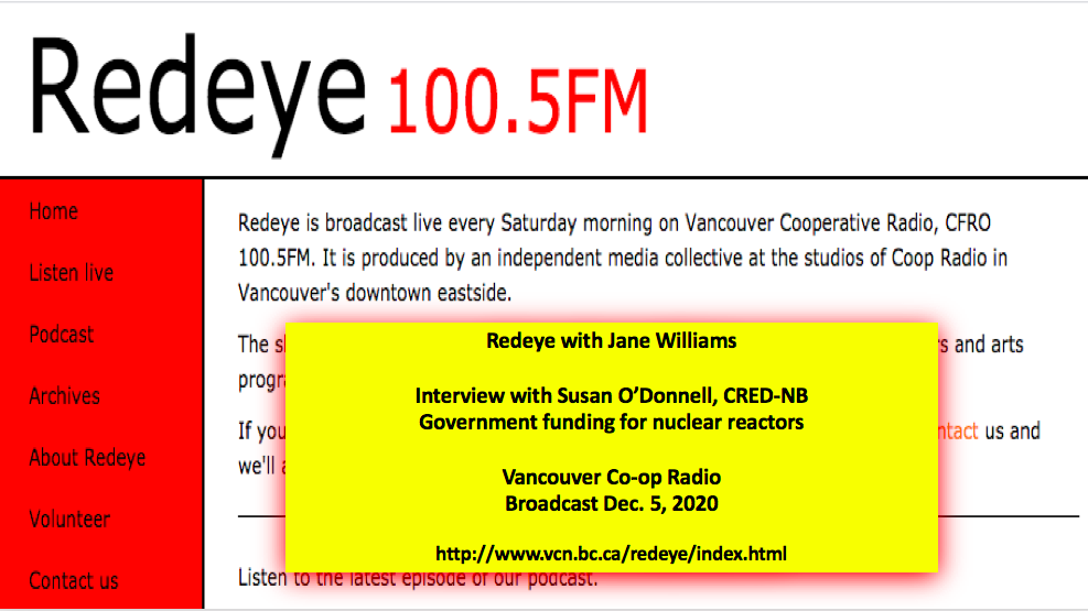 The nuclear industry’s latest plan for more public funding – small modular nuclear reactors (SMRs) – was featured today on Redeye, the Vancouver Co-op radio current affairs program. Host Jane Williams interviewed Susan O’Donnell from the RAVEN project at the University of New Brunswick and member of CRED-NB. Listen to the broadcast (16 minutes) on the video below.